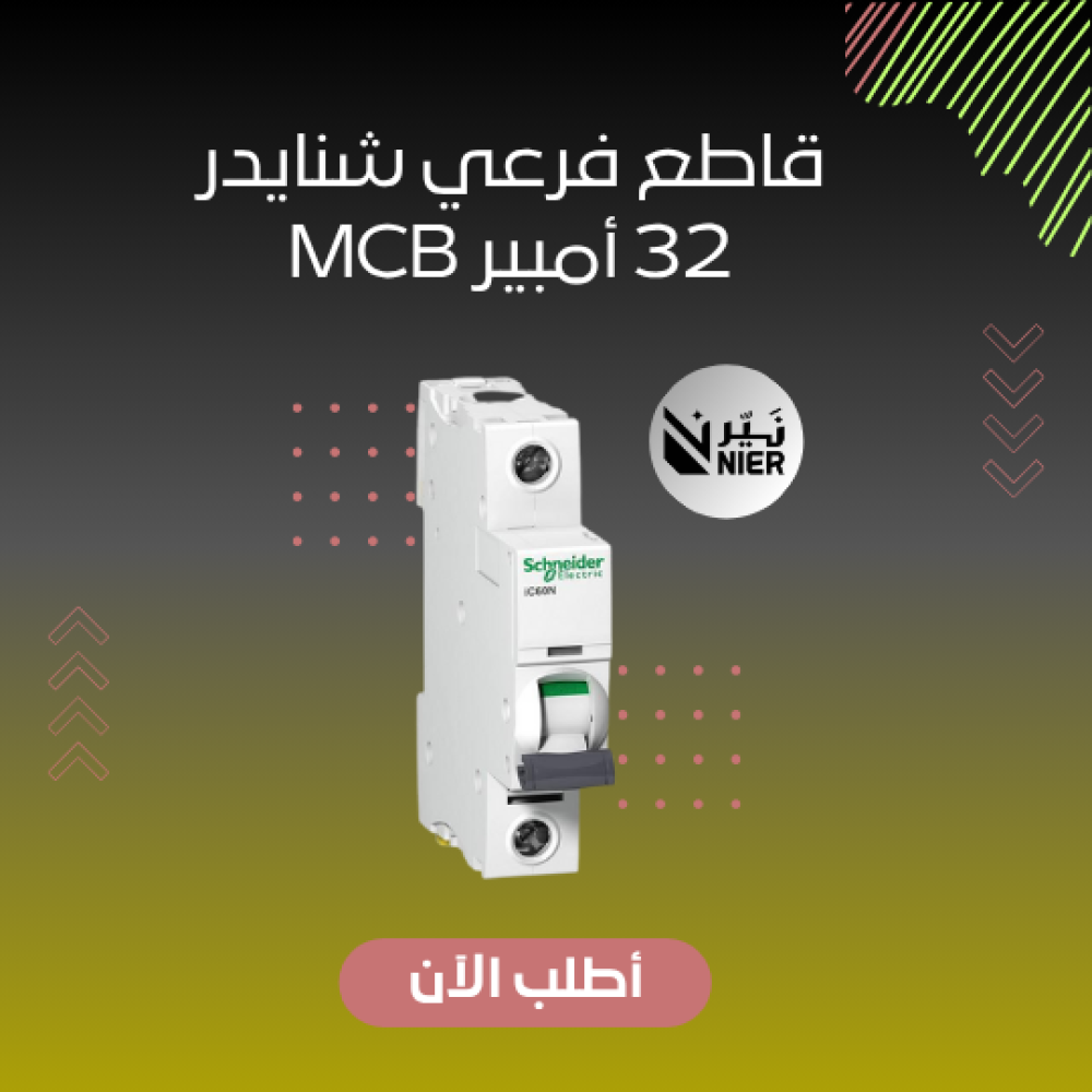 قاطع فرعي من شنايدر بتيار 32 أمبير، قطب واحد، MCB، نوع Curve C، جهد 400 فولت وسعة انقطاع تصل إلى 6KA.